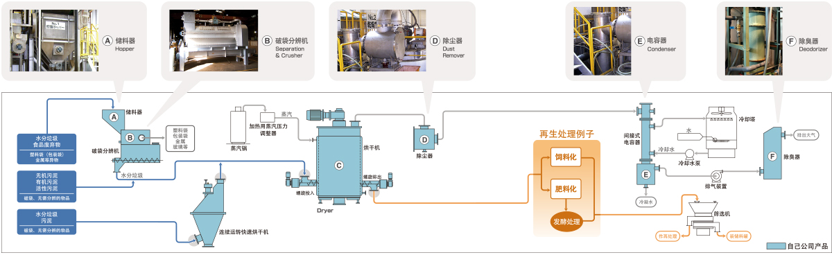 本系统将食品工厂、其他制造工厂、医疗设施、建筑行业等各种各样场所发生的食品废弃物以及污泥等在烘干机内同时实施粉碎和烘干,因此在短时间内高效地减少容量,生产出肥料化、饲料化等的能再生的原料。
