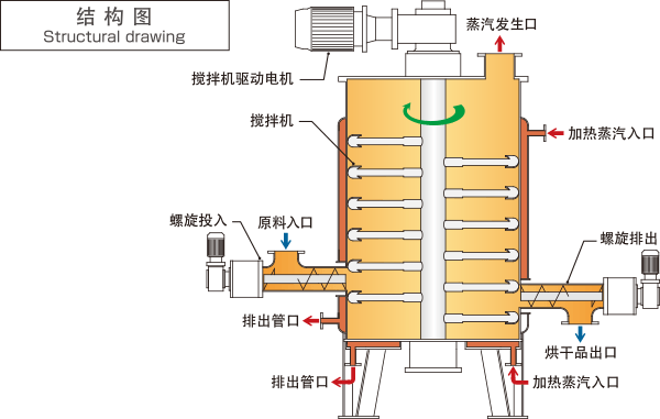通过加热方式和螺旋叶轮的搅拌,防止搅拌物变质,缩短烘干时间,实现节省能源。