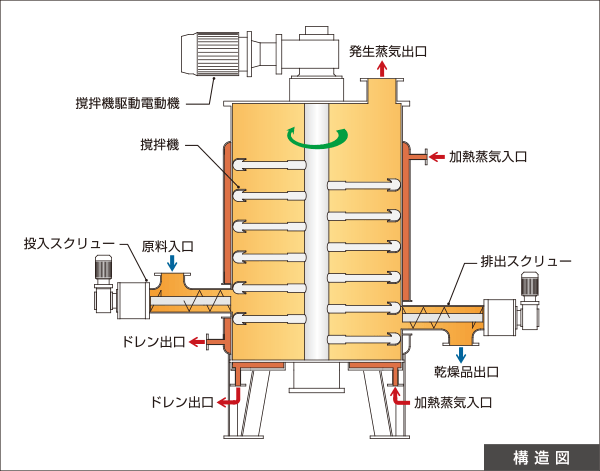 間接加熱方式かつ回転羽根による攪拌により、内容物の変質防止、乾燥時間の 短縮、省エネルギーが実現できます。